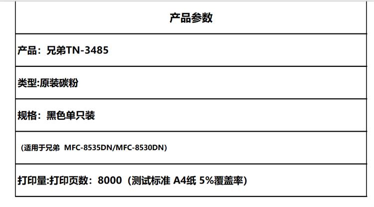 兄弟(brother)TN-3485 原装粉盒(鼓粉分离) 黑色单支装(适用兄弟5580、8530、8540、8545)打印页数:8000页(单位:支)