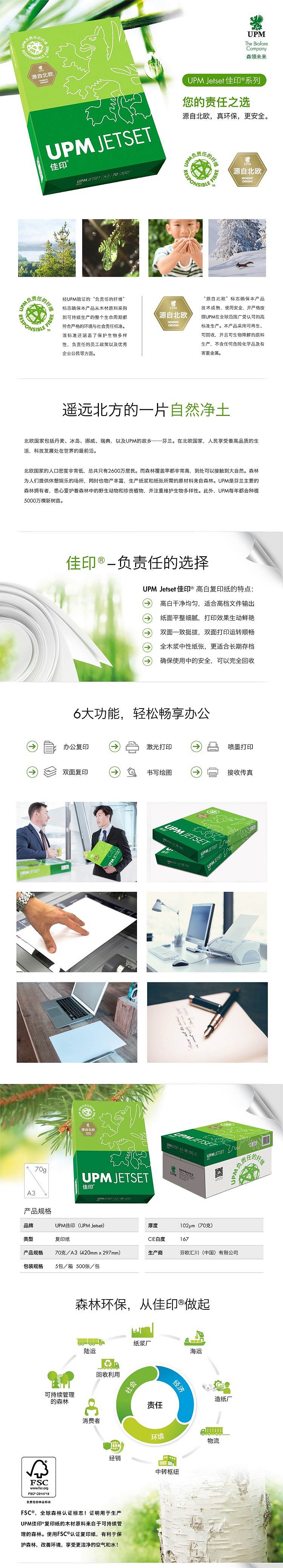 商品标题:UPM佳印70克/A3复印纸500张/包5包/箱(箱)