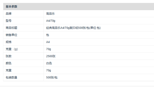 商品标题:经典高品乐A4/70g复印纸500张/包(单位:包)
