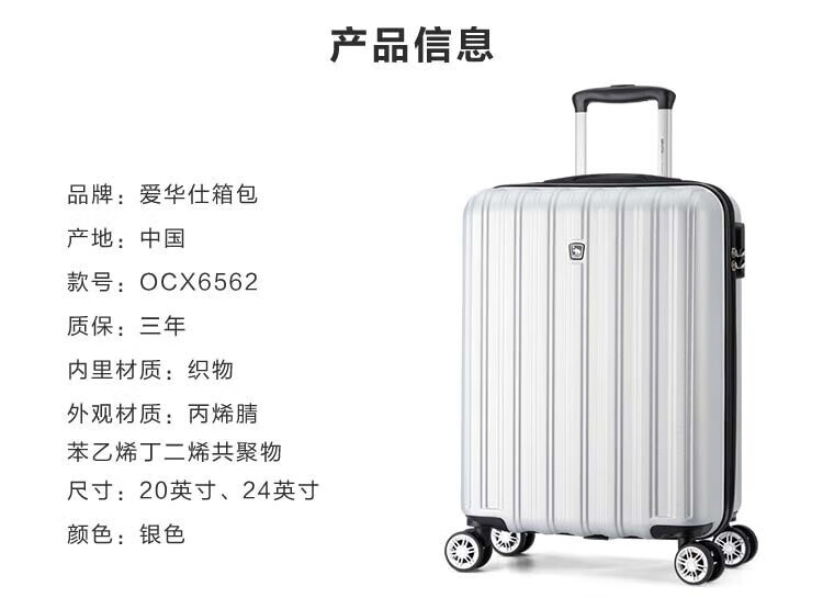 商品标题:爱华仕OCX6562拉杆箱24寸银色24寸(个)