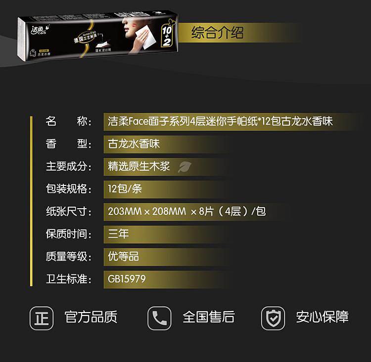 商品标题:洁柔BM038-12F古龙水手帕纸203*208mm4层8抽12包*36条(条)