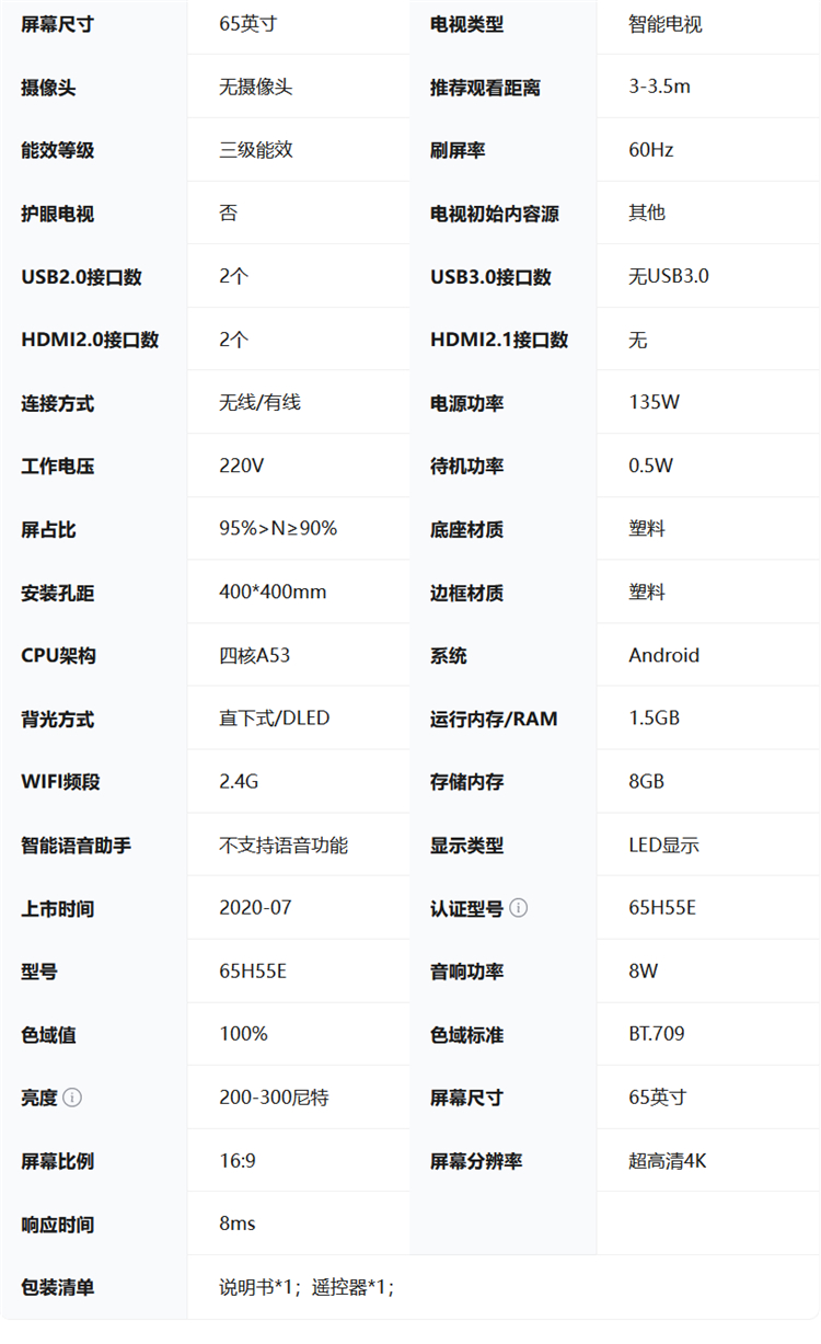 海信(Hisense)65H55E 65英寸平板电视(台)【含基础挂装】