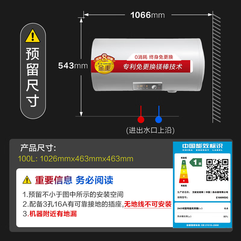 史密斯(A.O.SMITH) E100MDG 100L 速热 预约洗浴 金圭内胆 一级能效 电热水器 (计价单位:台) 白色