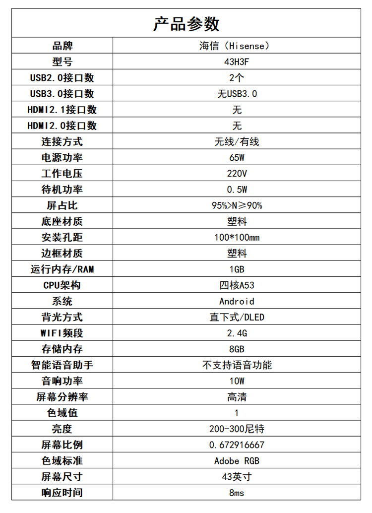 海信43H3F液晶电视机43寸(单位:台)黑色【含基础挂装】不含底座