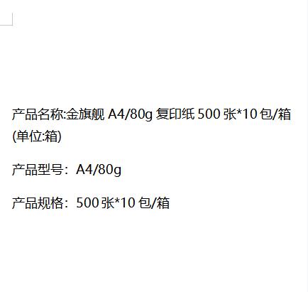 品牌:金旗舰;型号:无;商品规格:500张*10包/箱;商品标题:金旗舰A4/80g复印纸500张*10包/箱(单位:箱);销售单位:箱