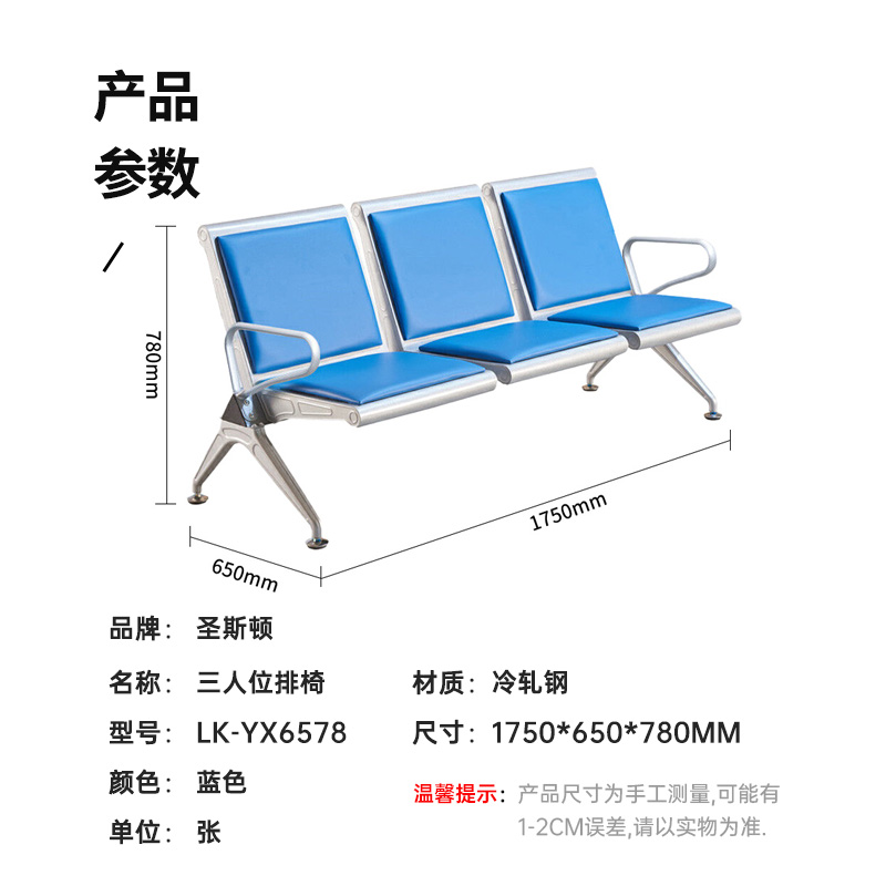 圣斯顿LK-YX6578钢制排椅三人位1750*650*780mm(单位:组)蓝色