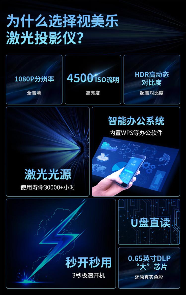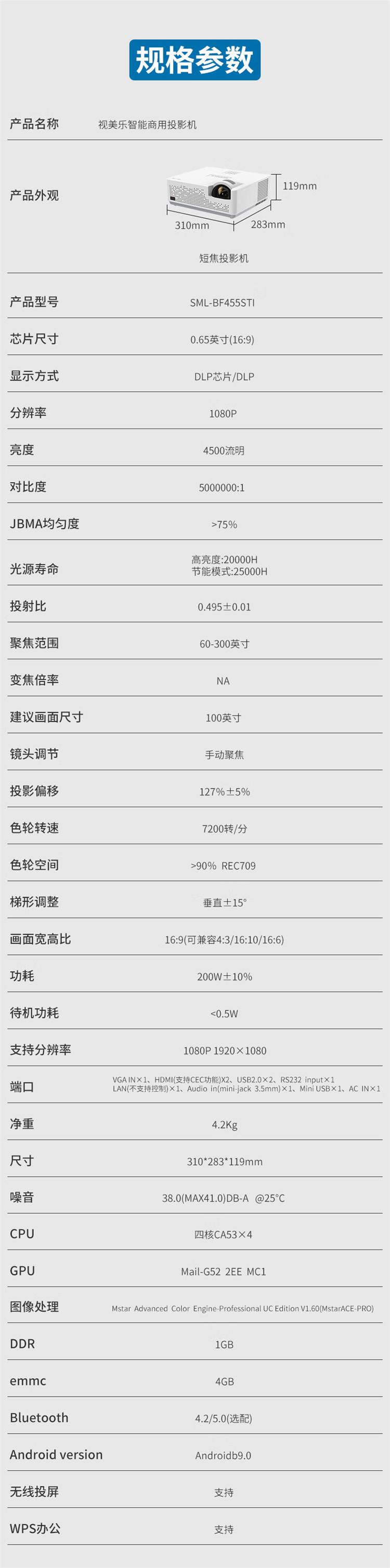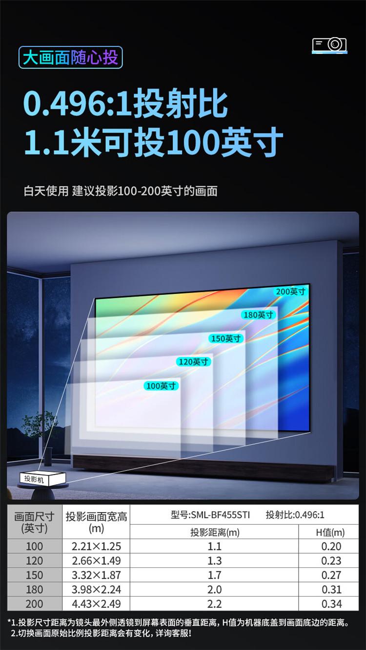 商品标题:视美乐SML-BF455STI短焦激光投影仪全高清1080P4500流明120HZ HDR无线同屏(单位:台)