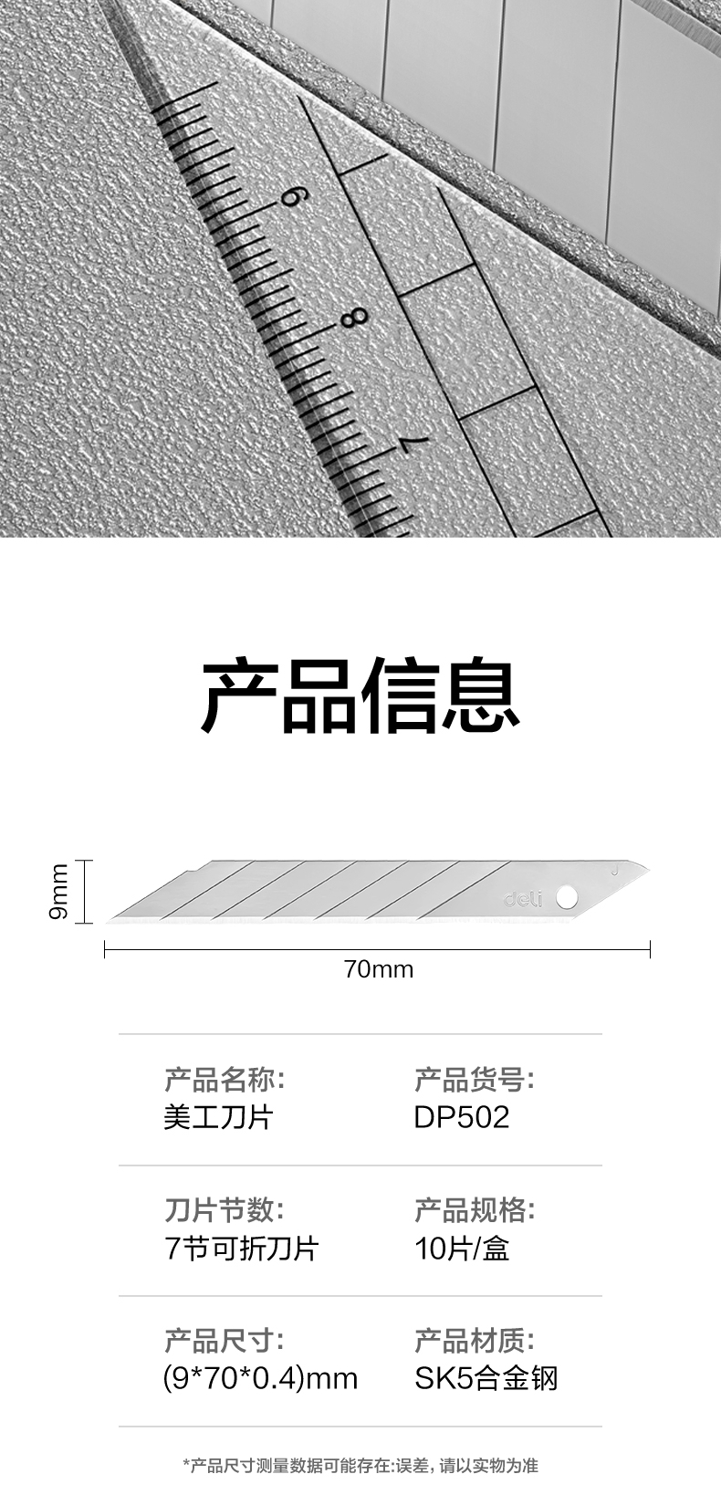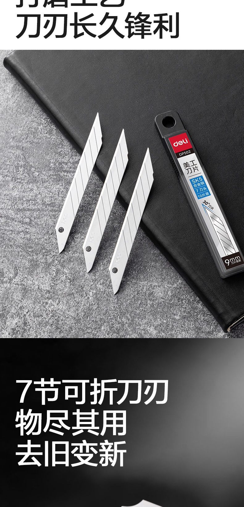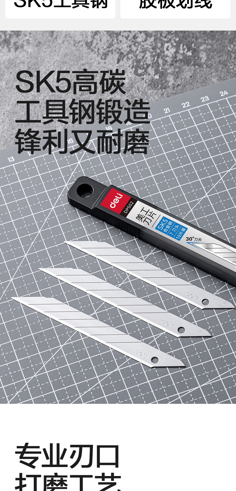 商品标题:得力DP502美工刀片9mm30°SK5(银色)(盒)