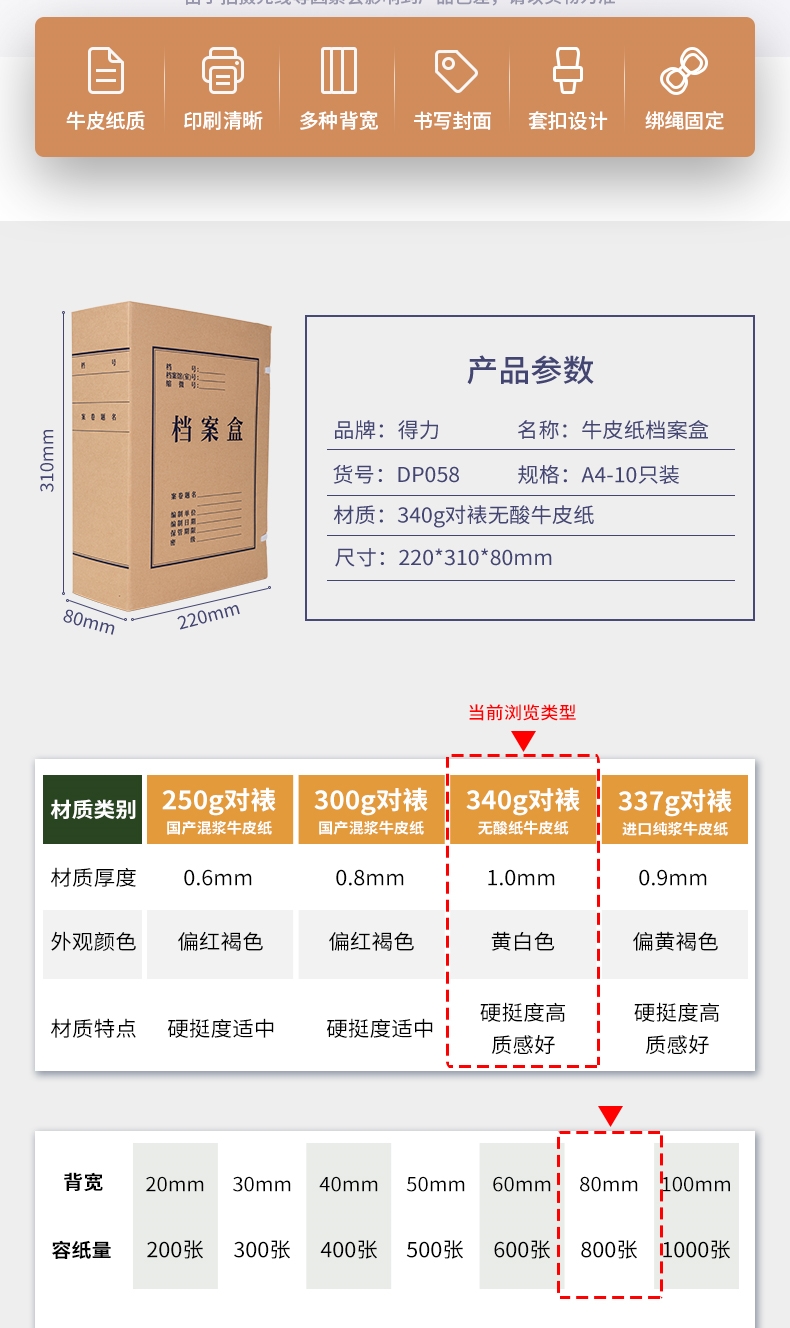 商品标题:得力DP058_340g无酸对裱牛皮纸80mm档案盒(棕黄)(10个/包)