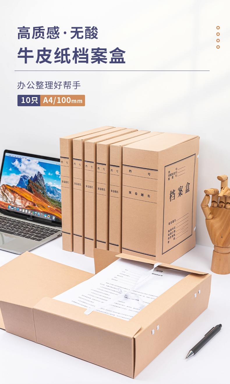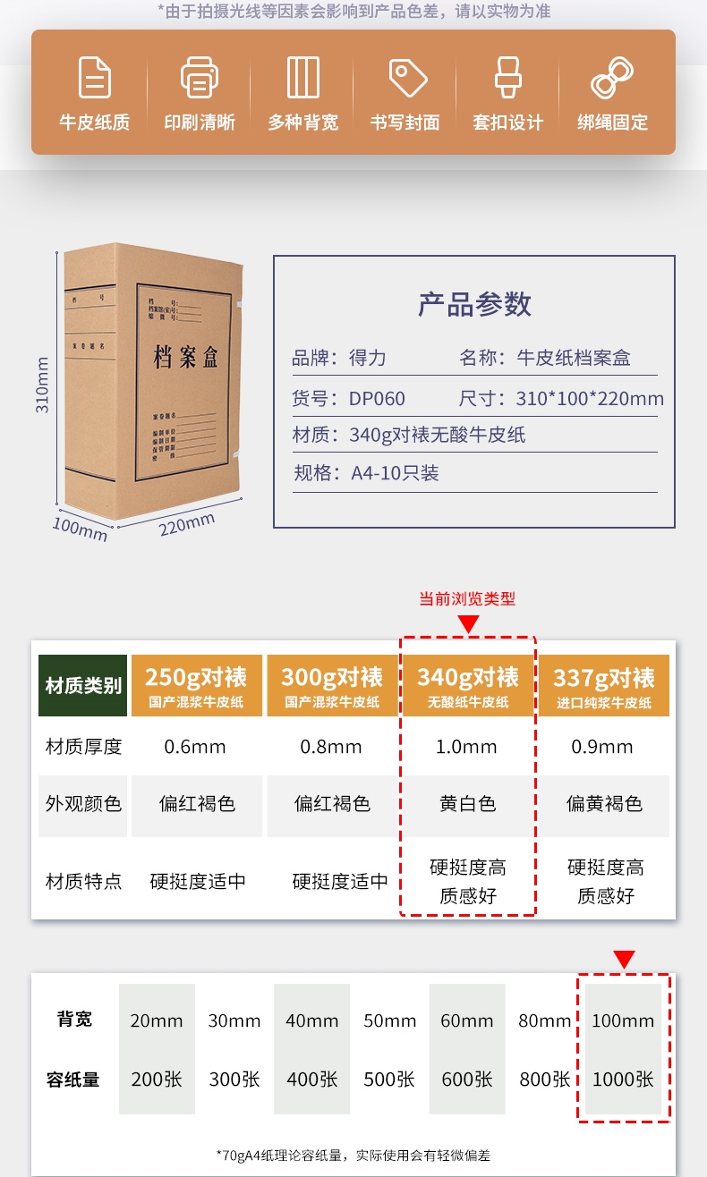 商品标题:得力DP060_340g无酸对裱牛皮纸100mm档案盒(棕黄)(10个/包)
