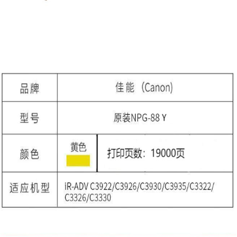 商品标题:佳能 NPG-88 TONER BK 原装黄色墨粉(适用于C3322L/C3326/C3935/C3930/C3926)(单位:支)