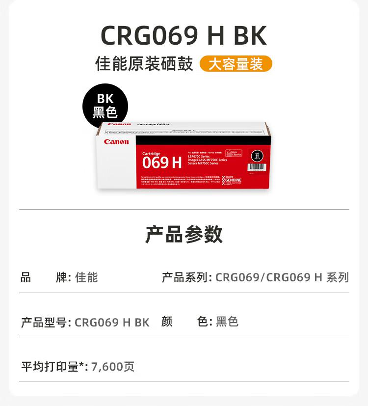 商品标题:佳能(Canon)硒鼓CRG-069H BK(适用LBP673Cdn,LBP673Cdw,LBP674Cx,MF752Cdw,MF756Cx)(单位:支)打印页数:7600页