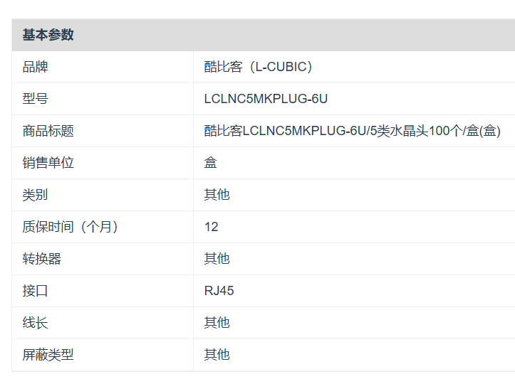 商品标题:酷比客 LCLNC5MKPLUG-6U 5类水晶头 100个/盒 /6U (盒)