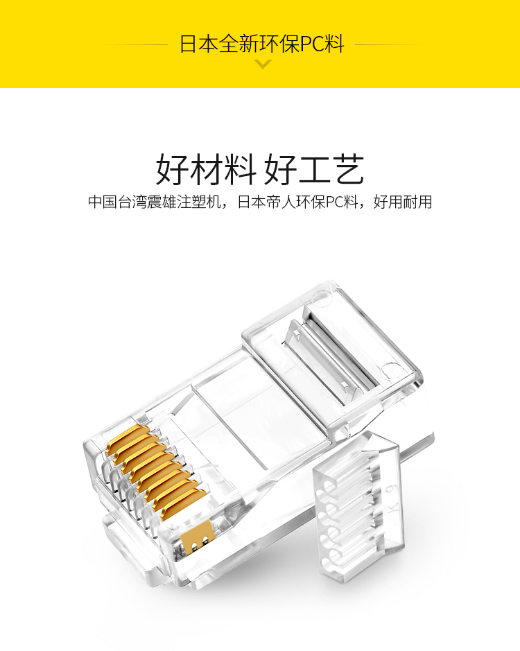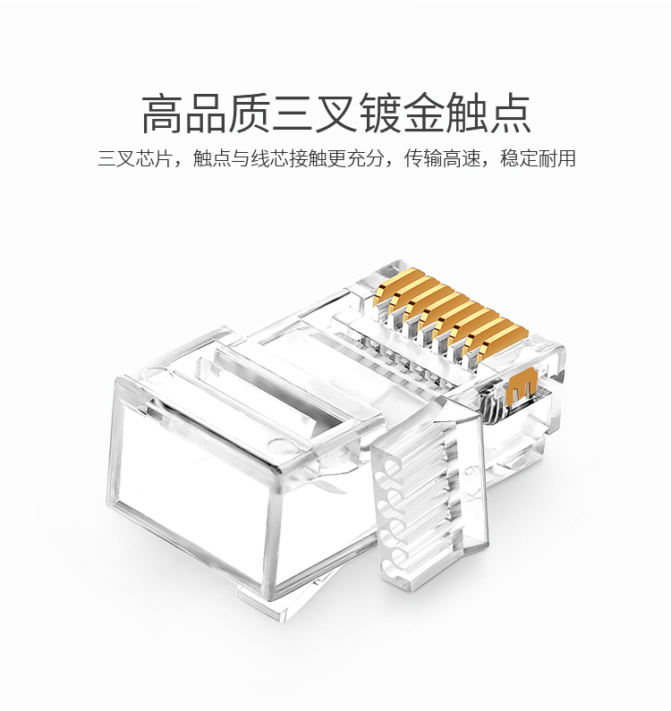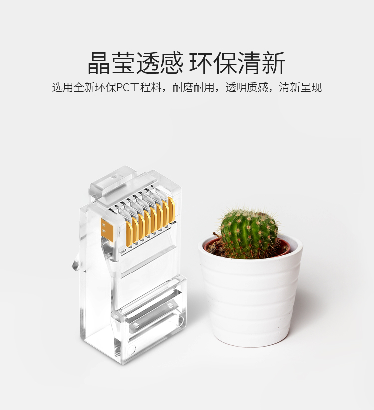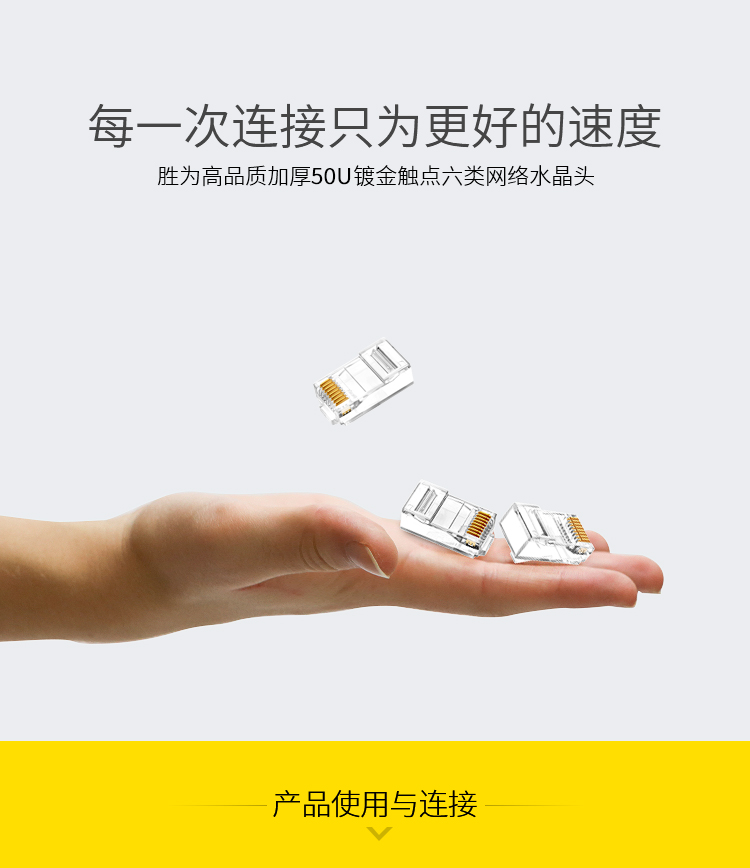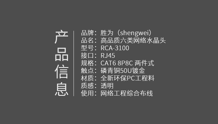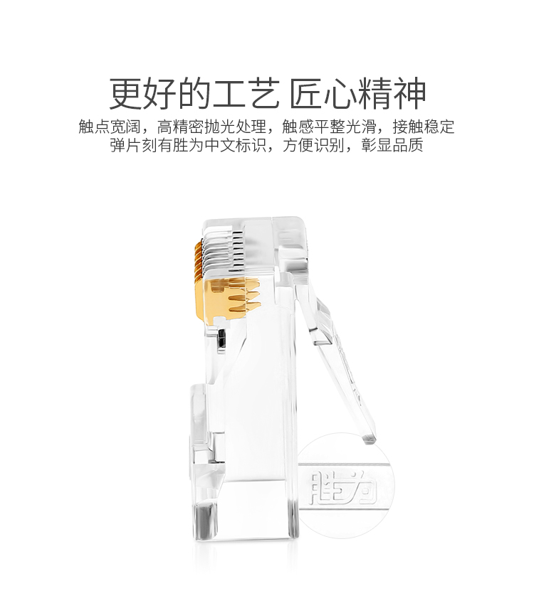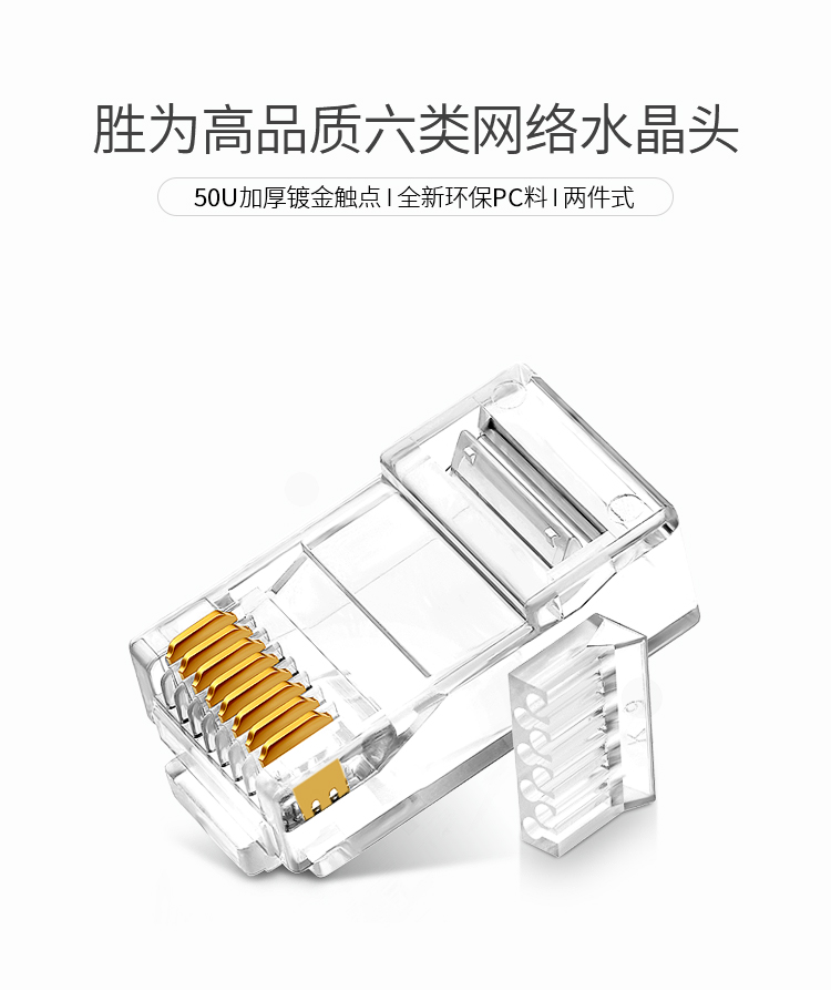 商品标题:胜为RCA-3100100个/盒50U镀金接头非屏蔽六类网络水晶头透明(盒)