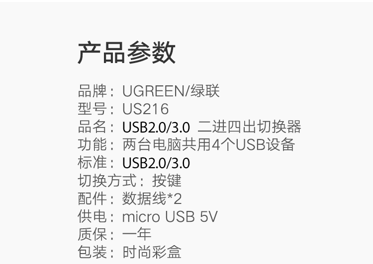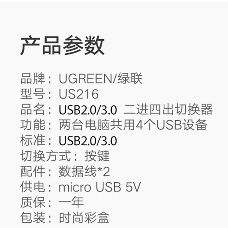 商品标题:绿联30768切换器USB3.0/2进4出(个)