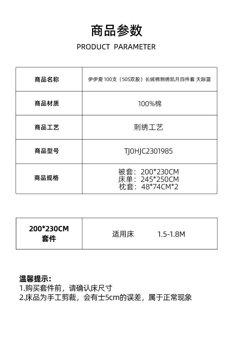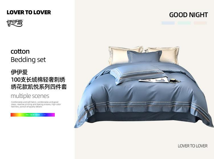 商品标题:伊伊爱TJ0HJC2301985长绒棉刺绣凯月四件套100支(50S双股)天际蓝200*230cm(套)