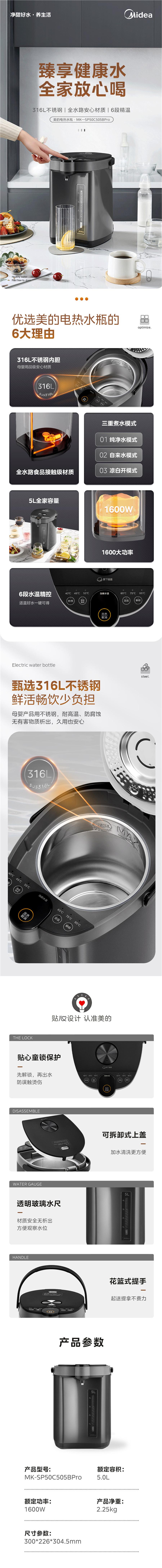 商品标题:美的(Midea)电热水瓶5L家用电热水壶多段温控双层防烫不锈钢内胆宿舍烧水器 MK-SP50C505BPro(台)