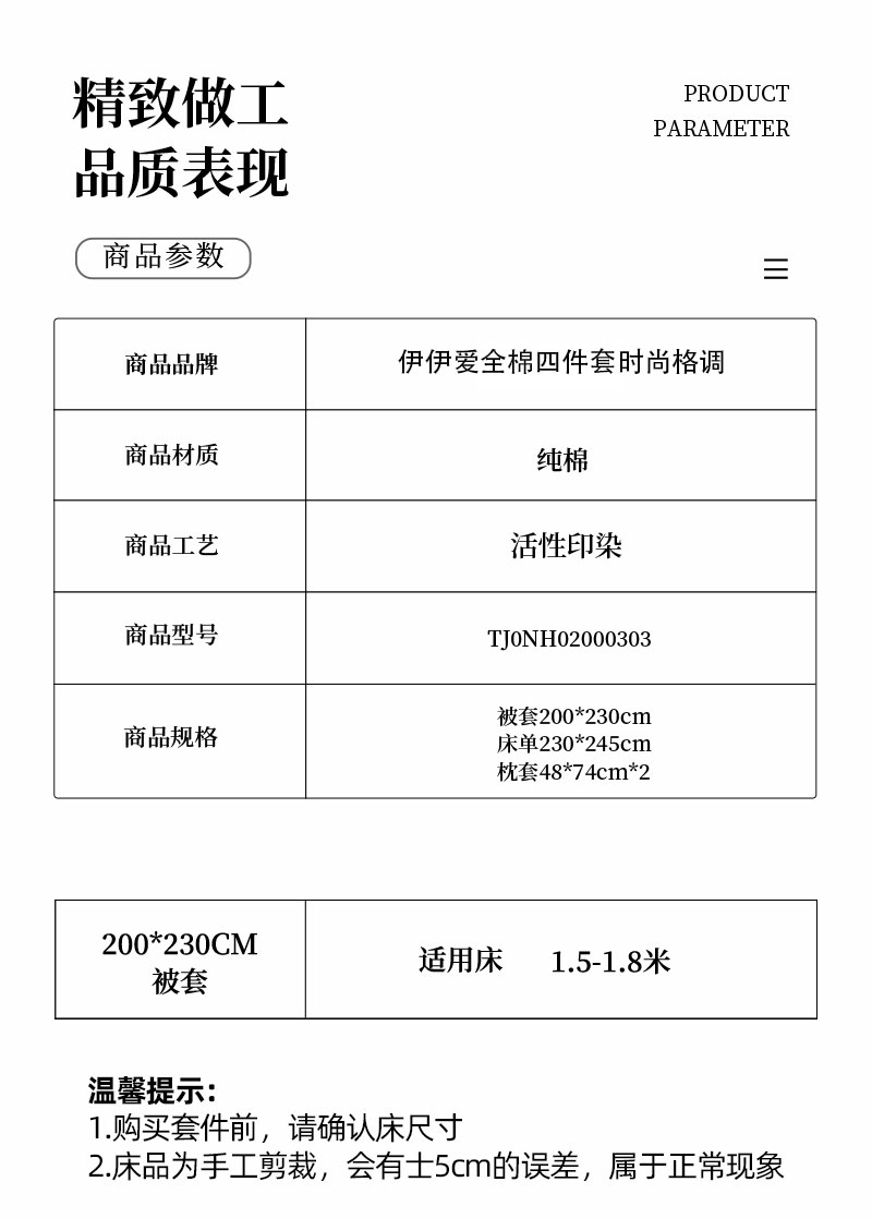 商品标题:伊伊爱TJ0NH02000303时尚格调全棉四件套200*230cm被套200*230cm*1床单230*245cm*1枕套48*74cm*2时尚格调(单位:套)