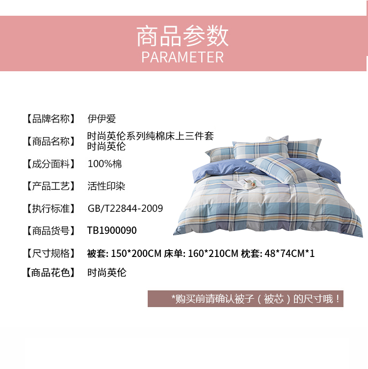 商品标题:伊伊爱TB1900090时尚英伦系列纯棉三件套被套150*200cm*1床单160*210cm*1枕套48*74cm*1时尚英伦(单位:套)