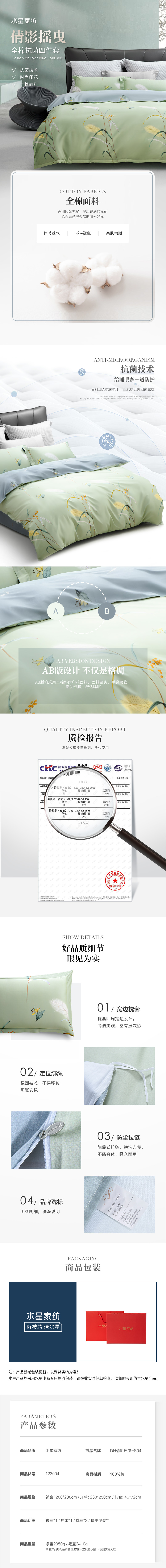 面料:100%棉 被套:200cm×230cm 床单:230cm×250cm 枕套:46cm×72cm