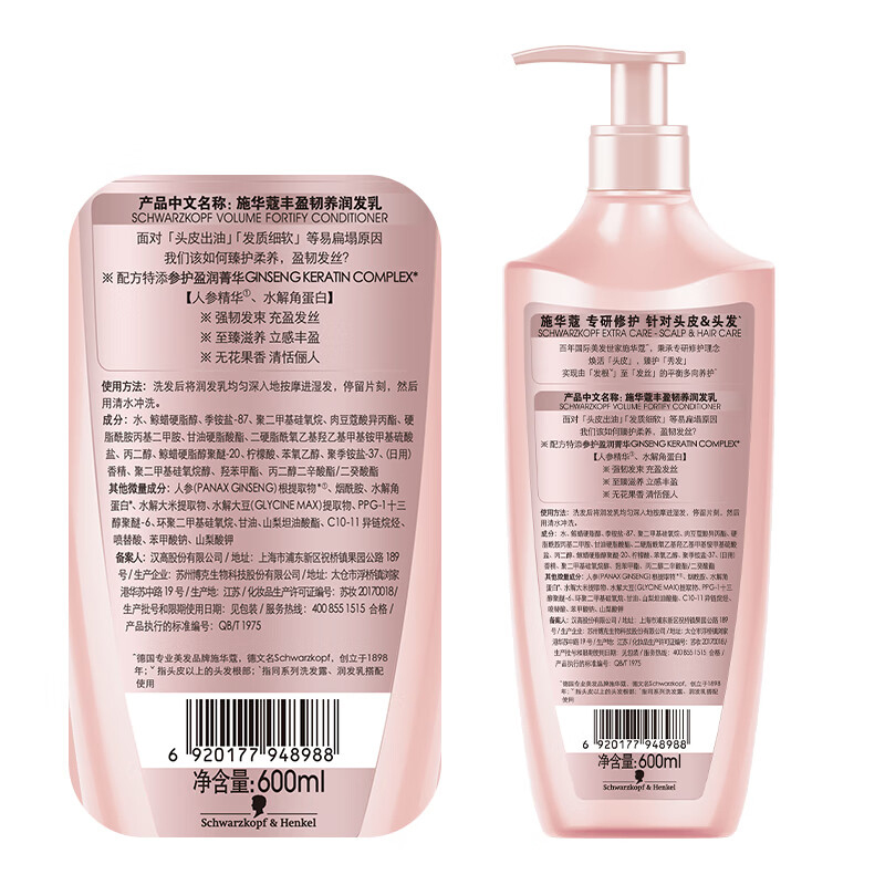 施华蔻(Schwarzkopf)丰盈韧养护发素600ml(单位:瓶)