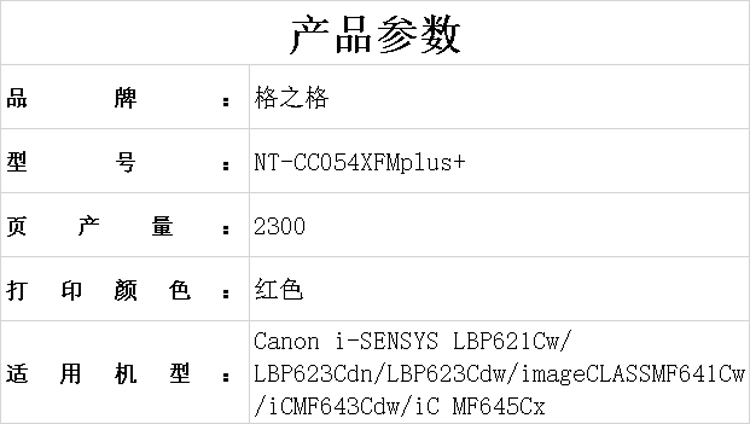 格之格NT-CC054XFMplus+兼容CRG054H M硒鼓(鼓粉一体)红色单支装(适用Canon i-SENSYS LBP621Cw/ LBP623Cdn/LBP623Cdw/imageCLASSMF641Cw/iCMF643Cdw/iC MF645Cx)打印页数:2300(单位:个)