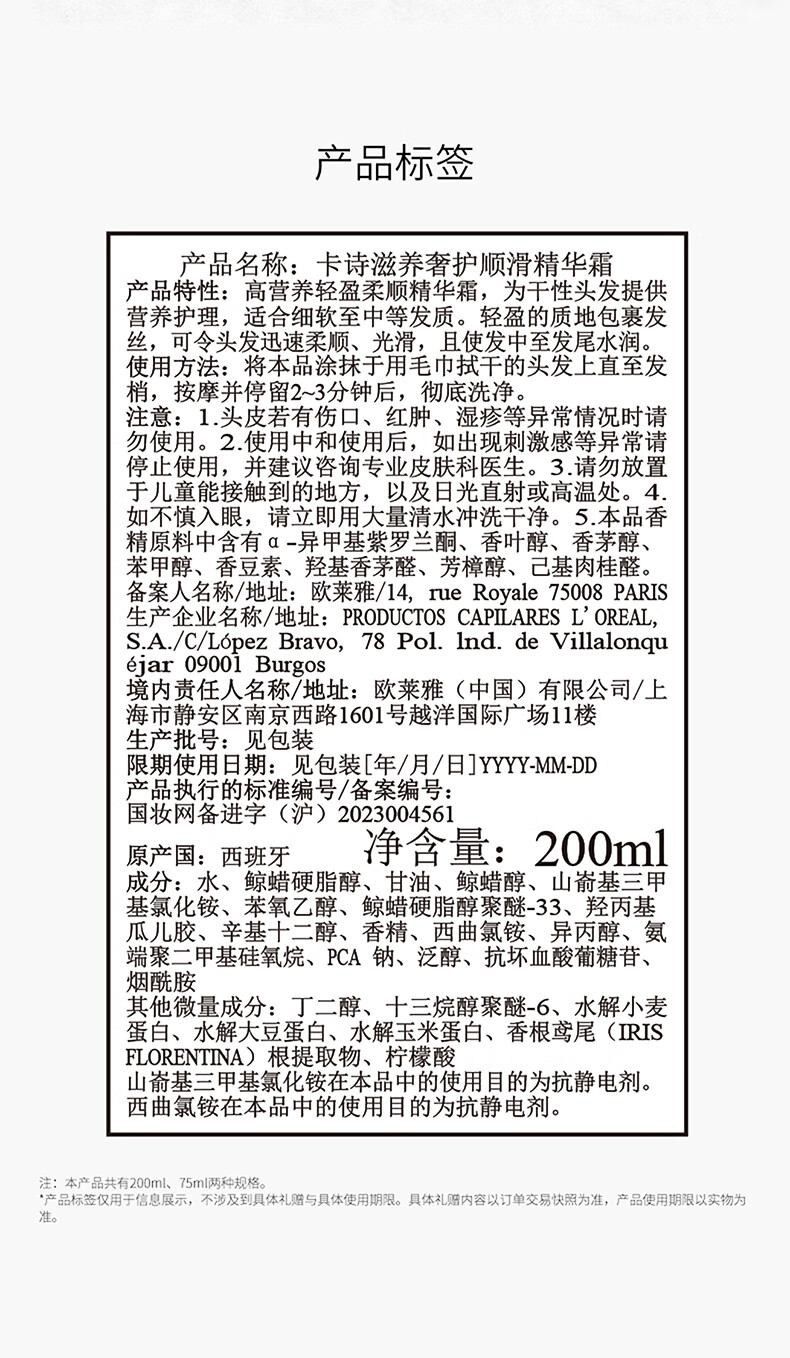 卡诗滋养奢护顺滑精华霜 200ML(瓶)