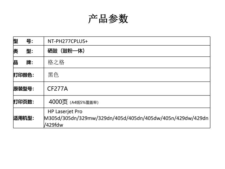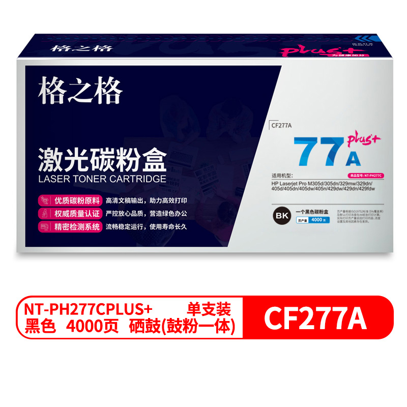 格之格(G&G)NT-PH277CPLUS+兼容CF277A硒鼓(鼓粉一体)黑色单支装(适用机型:HP Laserjet Pro M305d/305dn/329mw)打印量:4000页(个)