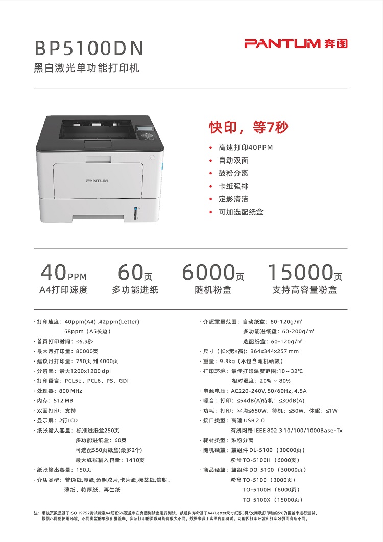 商品标题:奔图(PANTUM)BP5101DN黑白激光打印机 自动双面 有线网络连接 高速打印40页/分钟(单位:台)