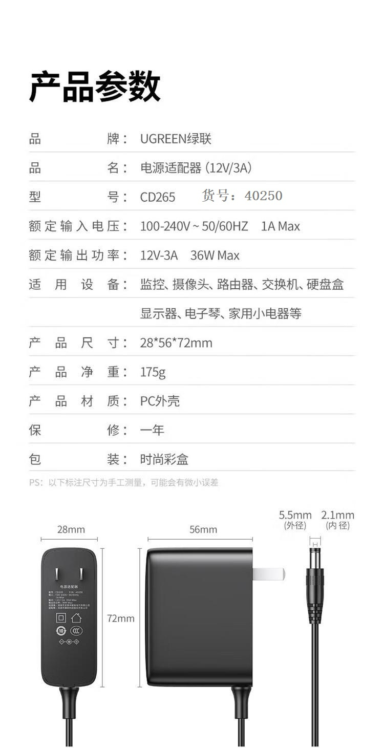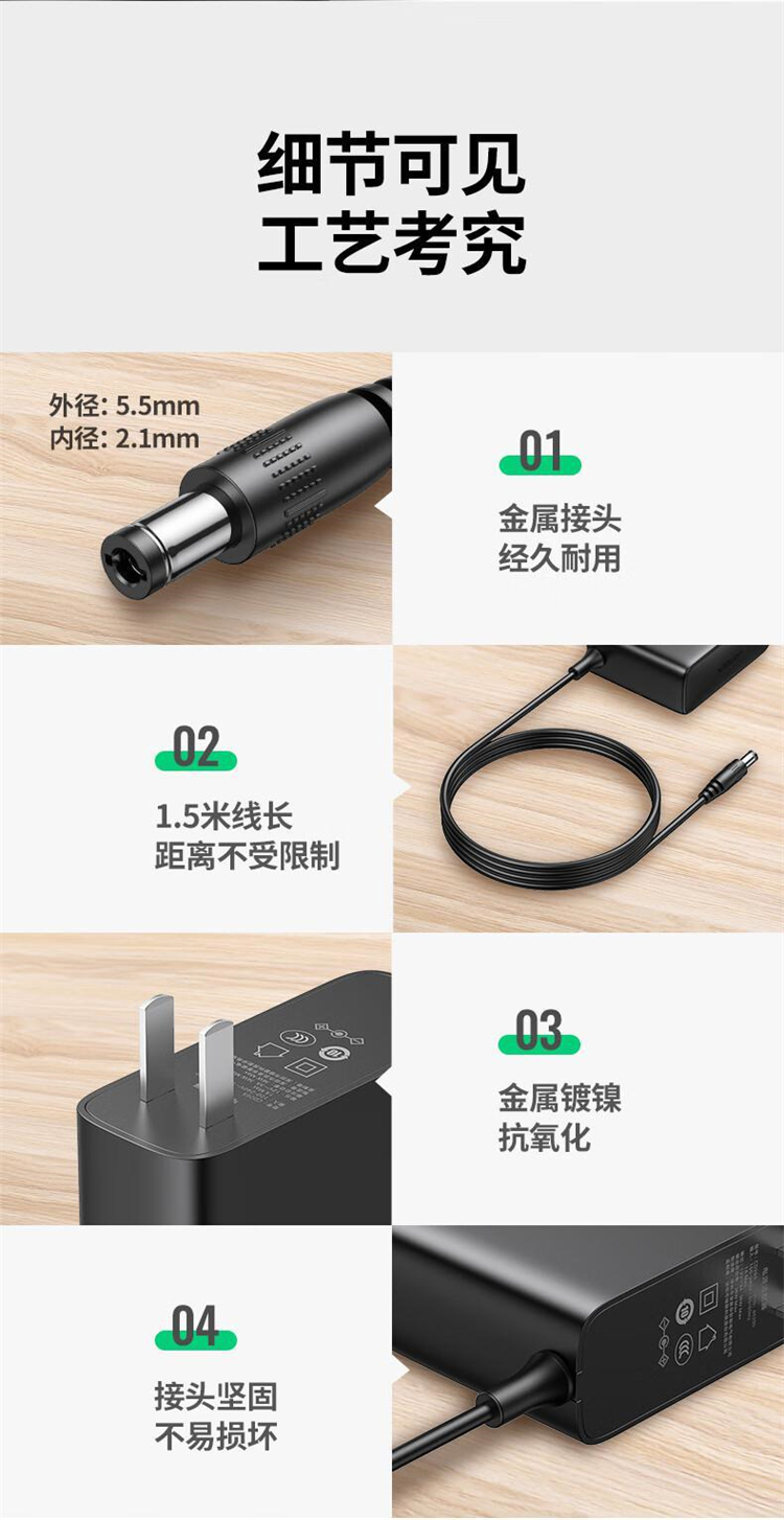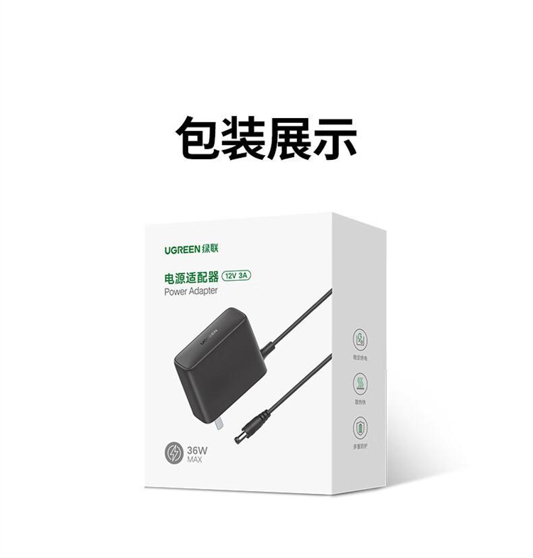 商品标题:绿联(UGREEN)电源适配器12V3A DC多功能充电器 适用监控器摄像头移动硬盒适配器供电 CD265 40250 (单位:个)