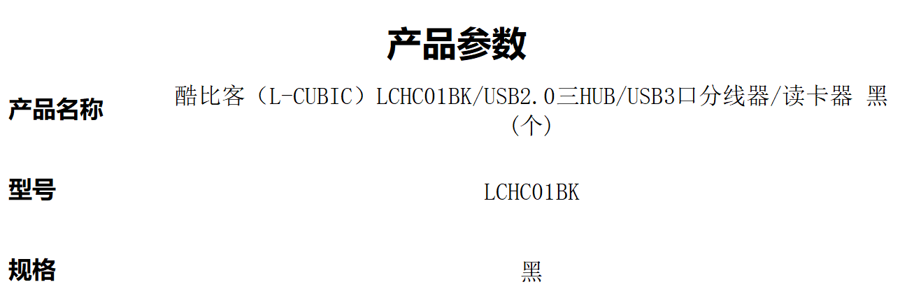 商品标题:酷比客LCHC01BK/USB2.0三HUB/USB3口分线器/读卡器黑(个)