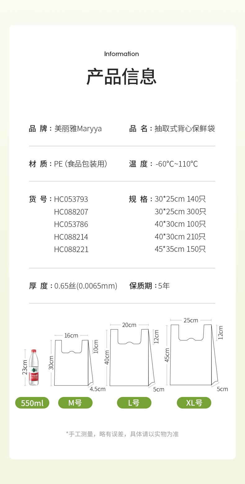 商品标题:美丽雅HC053793背心式保鲜袋30*25*140只(单位:包)