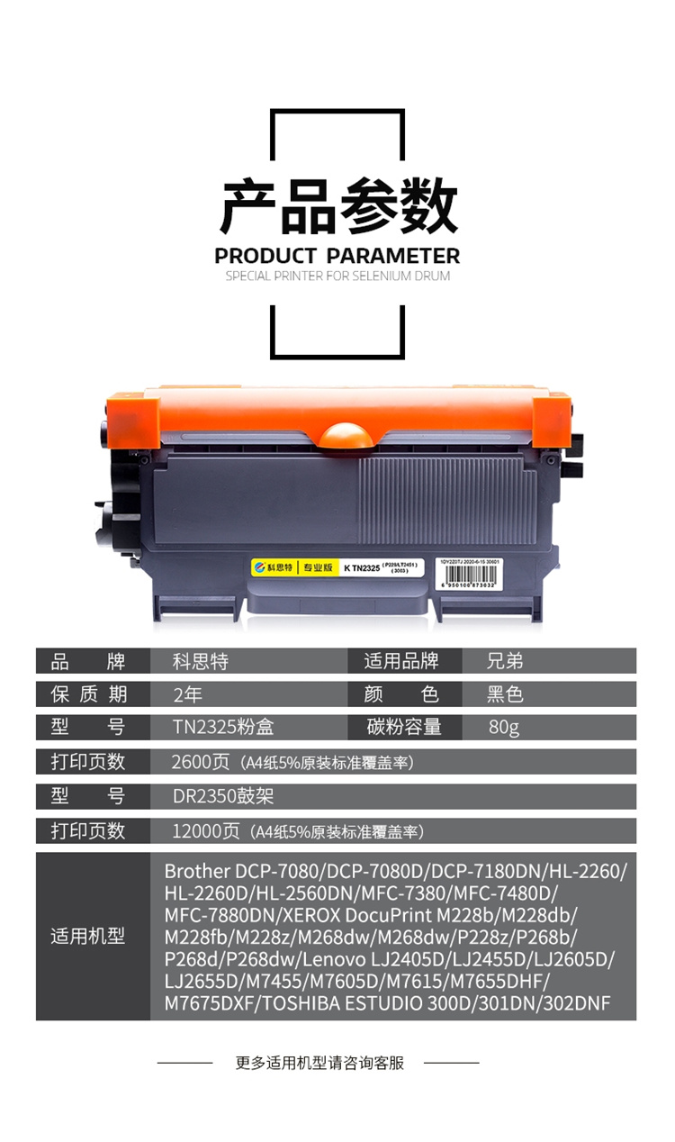 商品标题:科思特 TN-2325粉盒 适用兄弟 HL2260 DCP7080 专业版(支)
