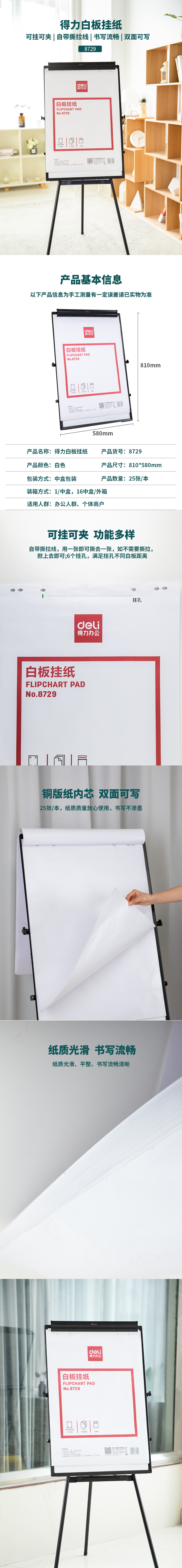 得力8729白板挂纸810*580mm(25张/卷 单位:卷)(白色)