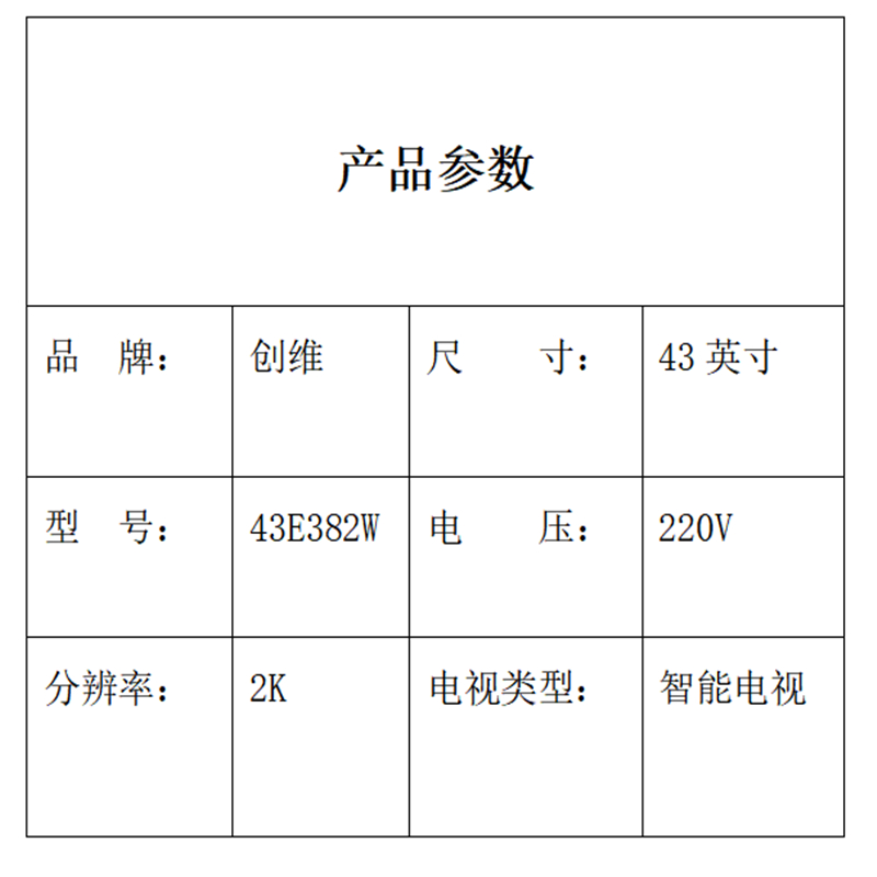 商品标题:创维43E382W电视机43英寸 黑色(台)