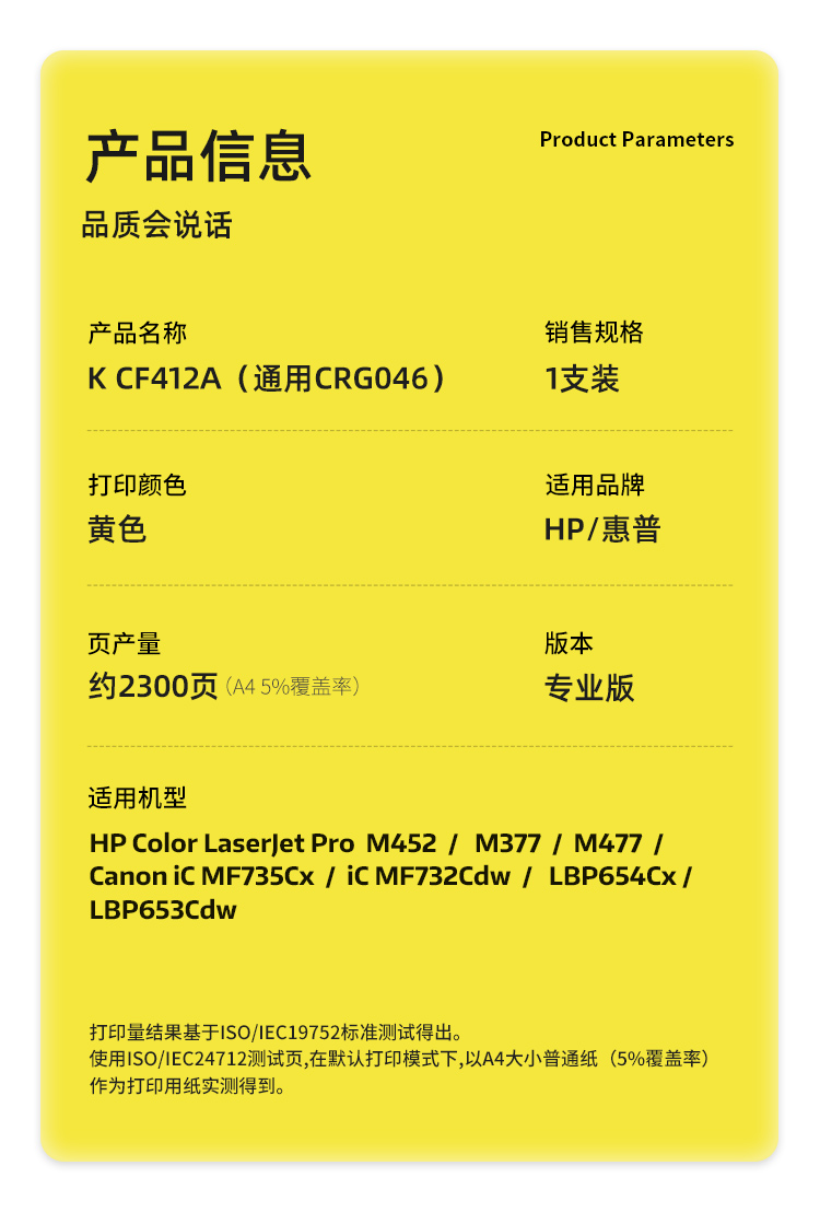 科思特(KST)兼容K CF412A/CRG046 硒鼓(鼓粉一体)黄色单支装(适用惠普M377dw M452nw/dn/dw M477fdw/fnw/dn))打印页数:2300页(单位:支)专业版