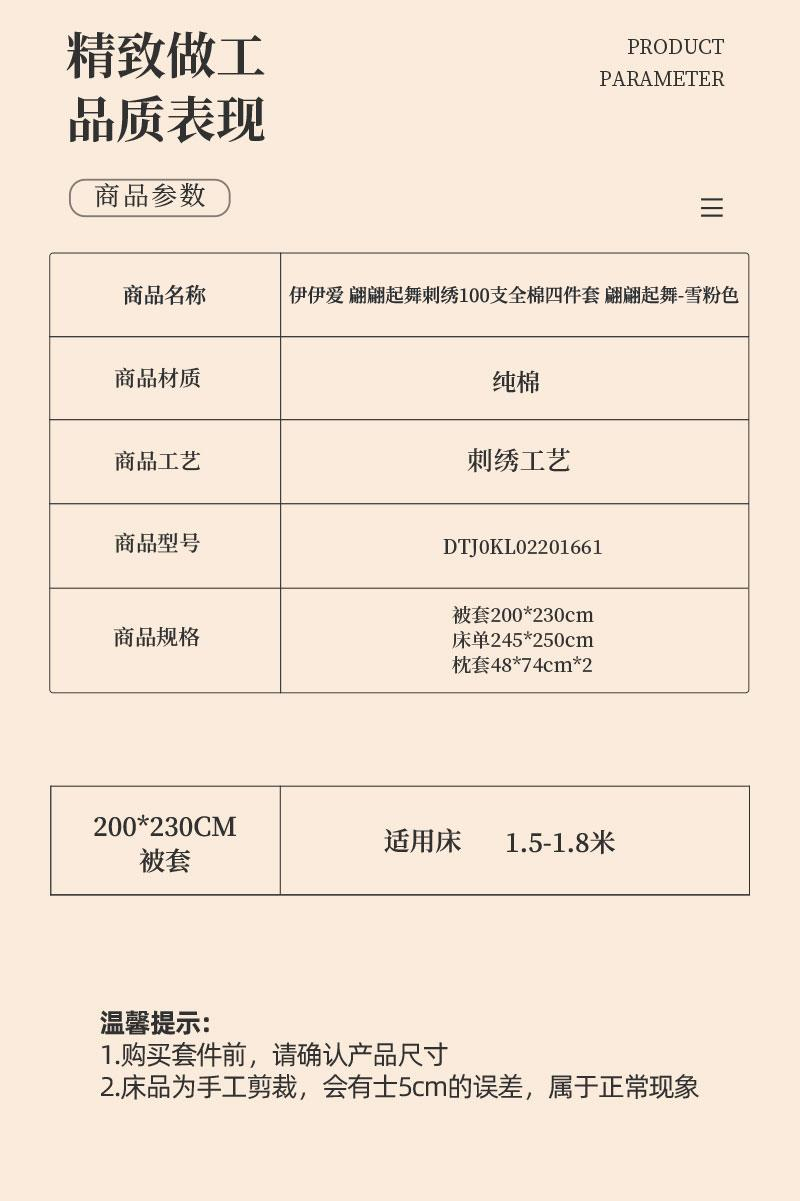 商品标题:伊伊爱DTJ0KL02201661翩翩起舞刺绣100支全棉四件套200*230cm(单位:套)雪粉色