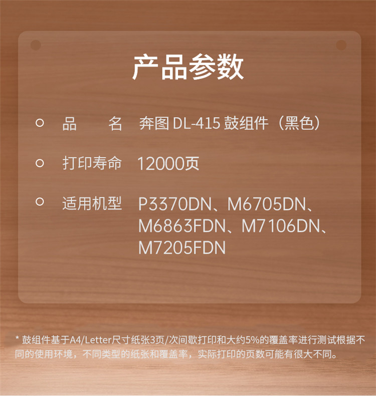 奔图DL-415原装鼓组件(鼓粉分离)黑色单支装(单位:支)适用机型:P3370DN/M6705DN/M7106DN/M6863FDN/M7205FDN/P3325DN/M7125DN /BP4005DN/BM4005ADN/BM4005FDN打印页数:12000页