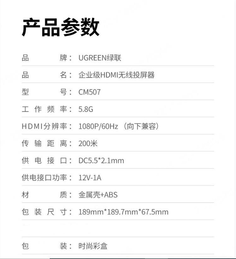 商品标题:绿联(UGREEN) CM507 HDMI无线延长传输器 200米高清 无线投屏器