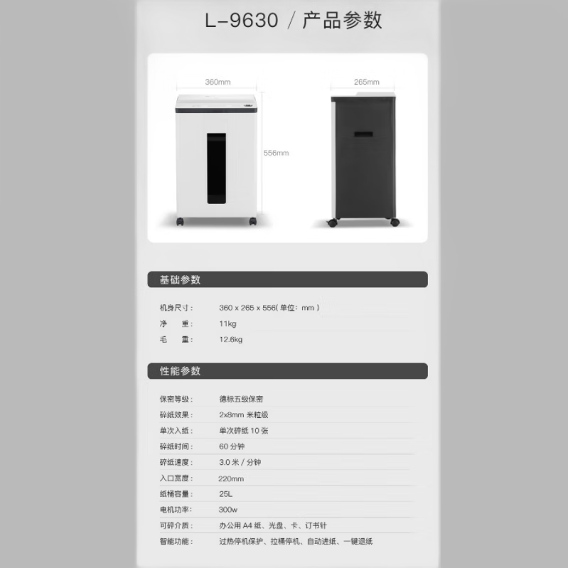 科密 L-9630 5级保密办公商用碎纸机(单次10张 持续60分钟 25L 可碎卡、光盘、订书针)(台)