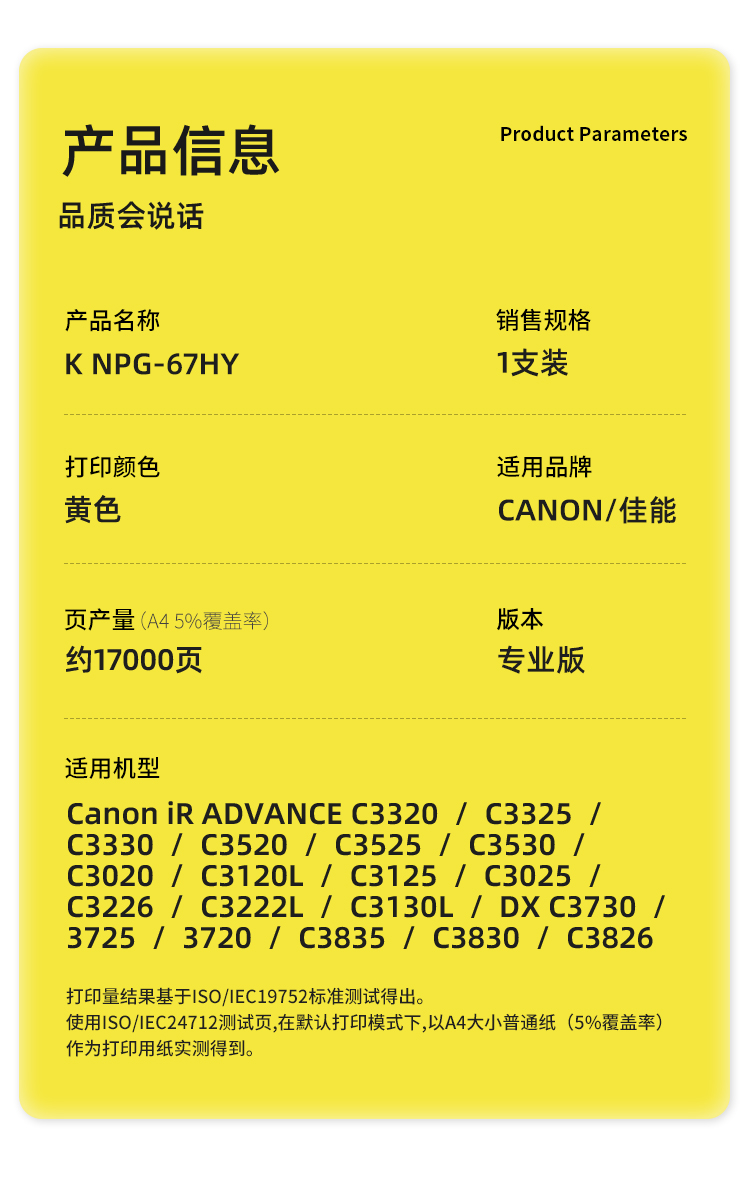 科思特(KST)兼容K NPG-67HY 粉盒(鼓粉分离)黄色单支装(适用Canon iR ADVANCE C3320/C3325/C3330/C3520/C3525/C3530/C3020/C3120L/C3125/C3025)打印页数:17000页(支)