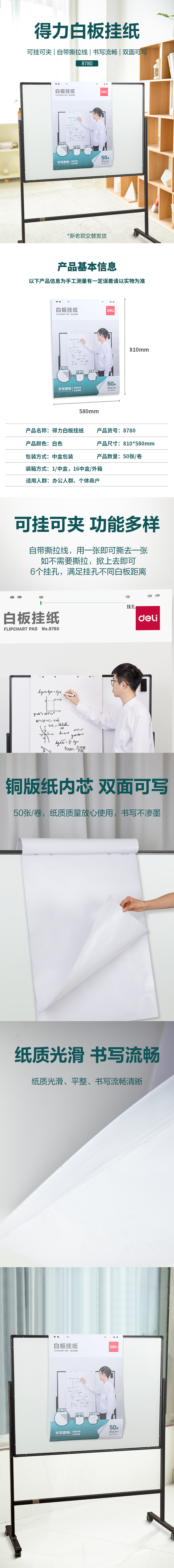 商品标题:得力8780白板挂纸810*580mm(50张/卷)(白色)(盒)