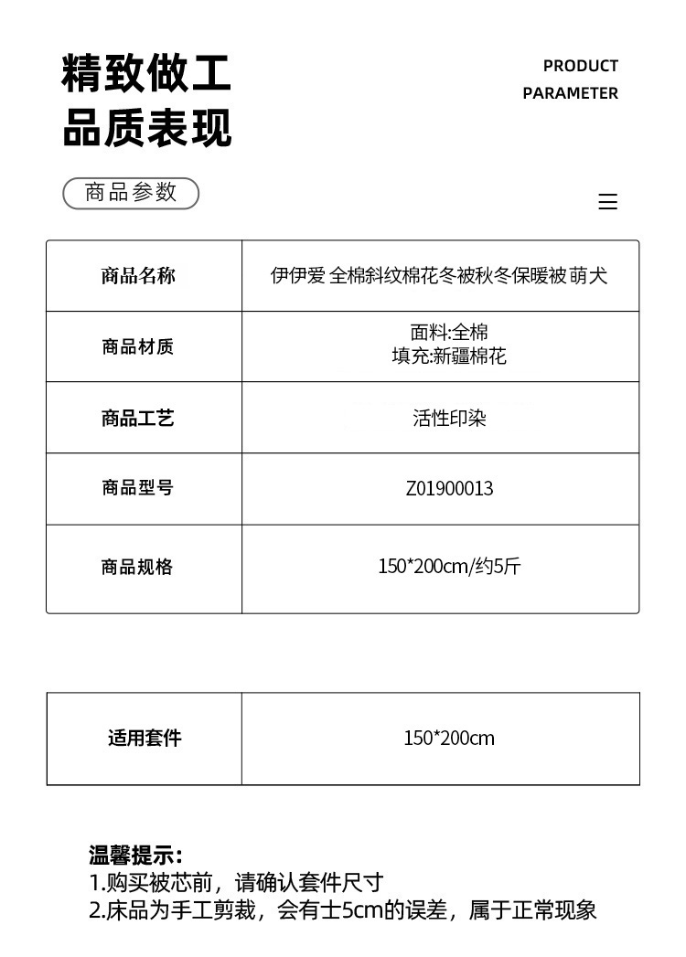 商品标题:伊伊爱Z01900013全棉斜纹棉花冬被秋冬保暖被5斤150*200cm(条)萌犬