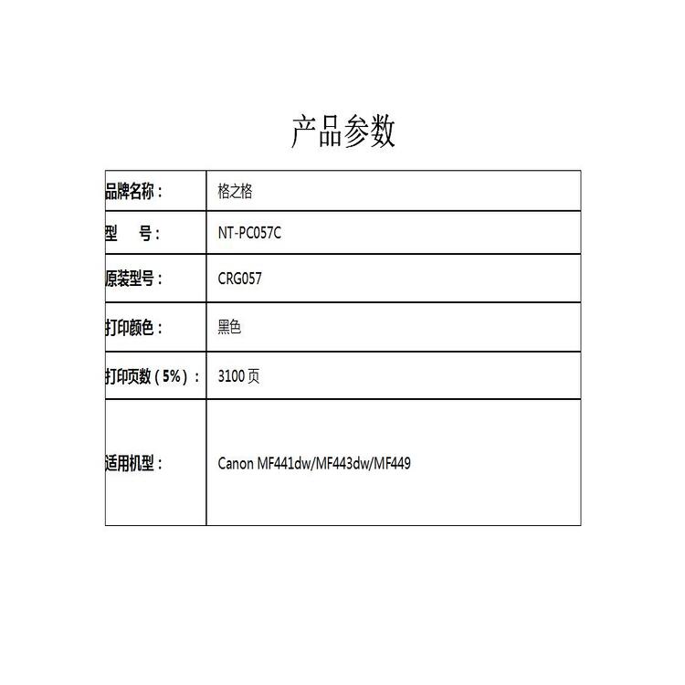 格之格NT-PC057C兼容CRG057硒鼓(鼓粉一体)黑色单支装(适用Canon MF441dw/MF443dw/MF449)打印页数:3100(单位:个)