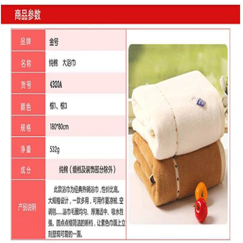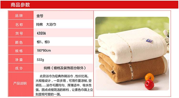 商品标题:金号赤金4320A提缎*浴巾180*80cm550g(条)