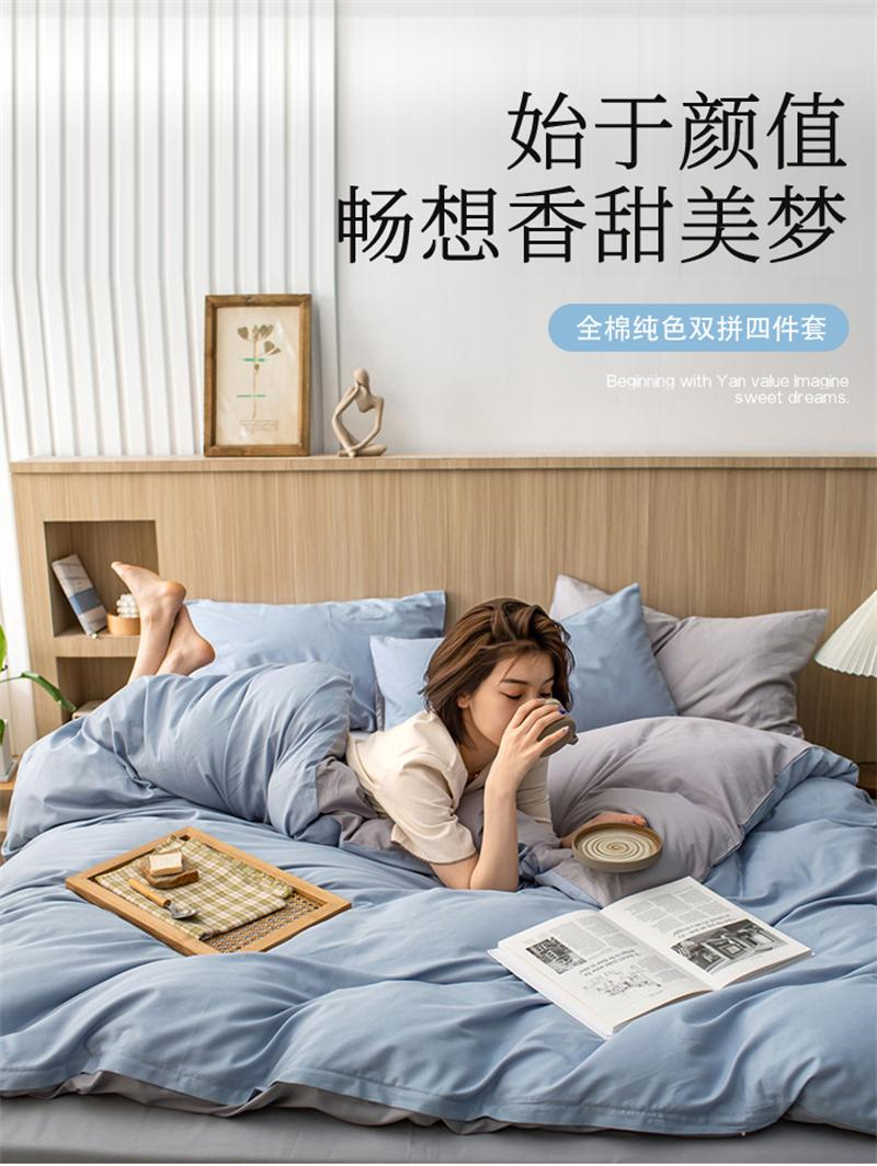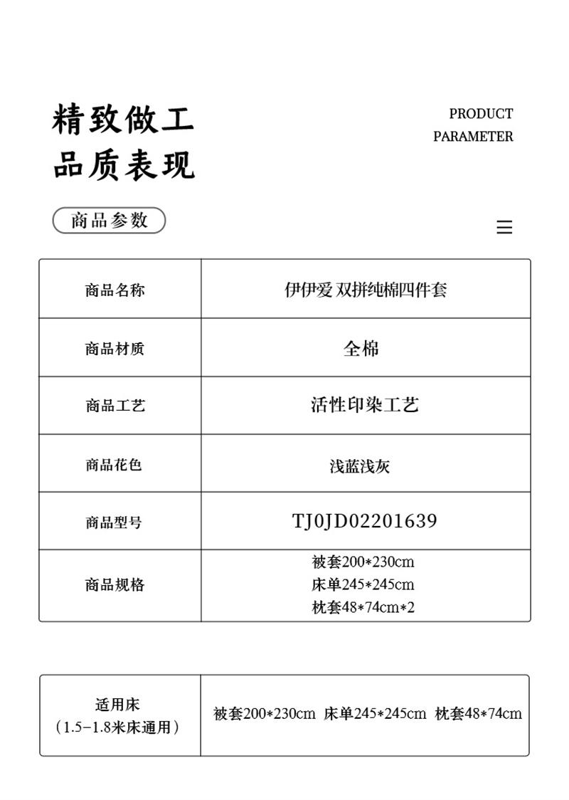 商品标题:伊伊爱TJ0JD02201639双拼纯棉四件套200*230cm(单位:套)浅蓝+浅灰