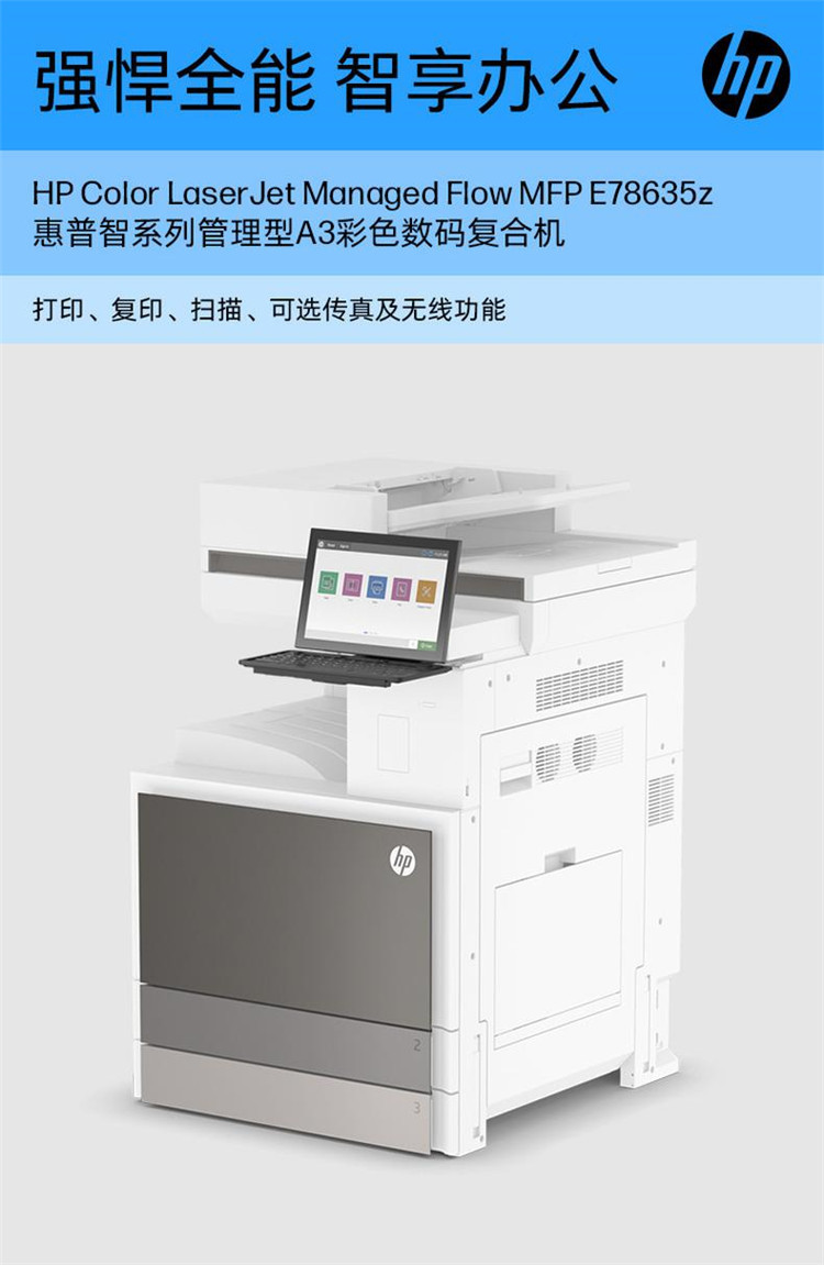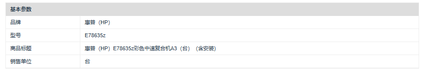 </1i>品牌:惠普(HP)</1i>型号:E78635z</1i>商品标题:惠普(HP)E78635z彩色中速复合机A3(含输稿器、双纸盒)(台)</1i>销售单位:台</1i>质保期:一年</1i>包装清单:机器、电源线、随机耗材、用户指南
