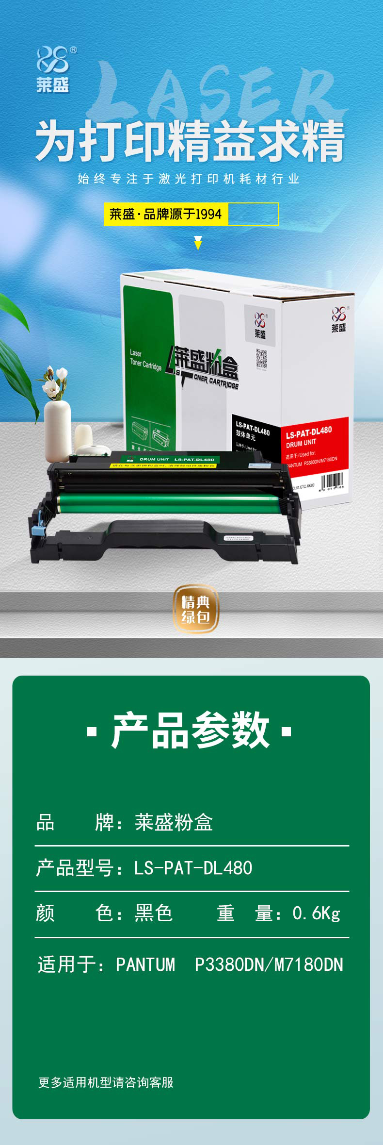 商品标题:莱盛 LS-PAT-DL480 鼓组件(鼓粉分离)黑色单支装(适用于PANTUM P3380DN/M7180DN)打印页数:12000 (单位:支)