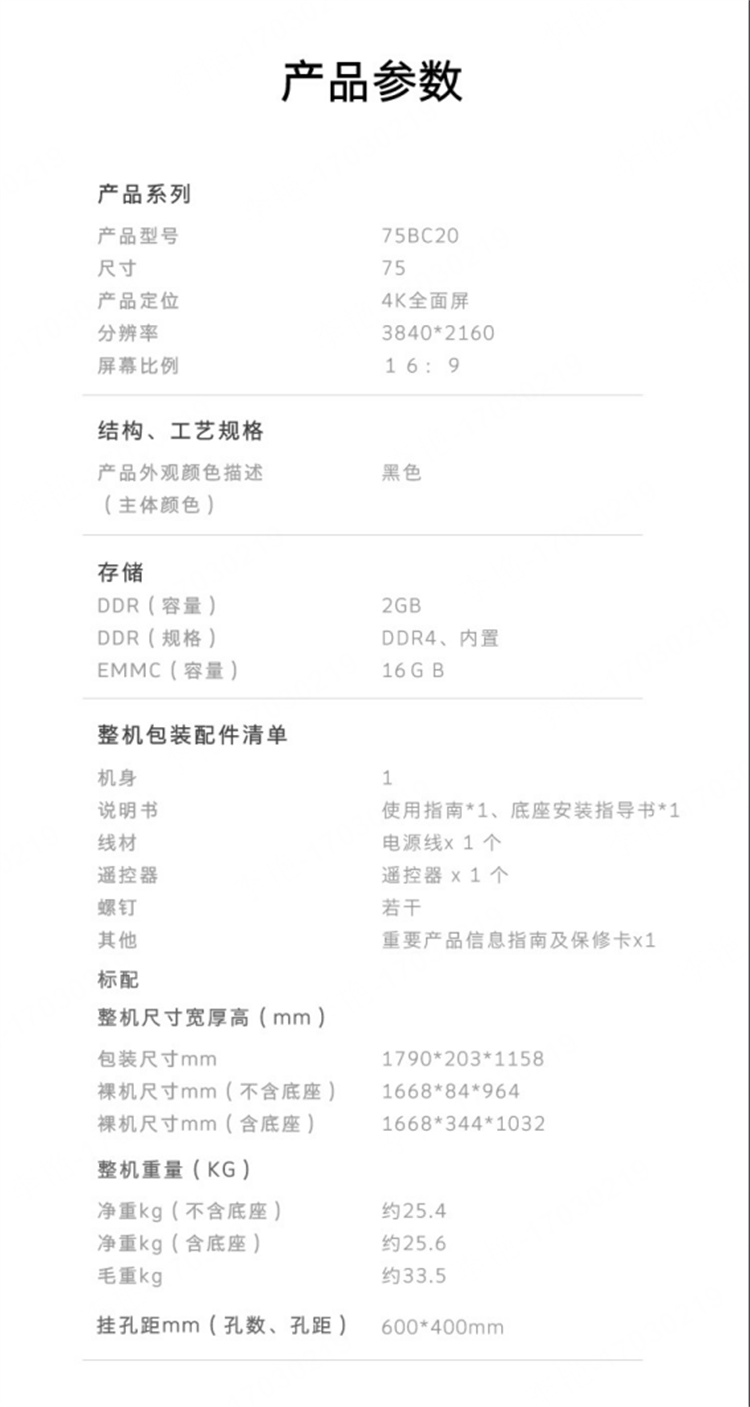 商品标题:创维(Skyworth)75BC20平板电视2+16G全面屏无开机广告75英寸(台)