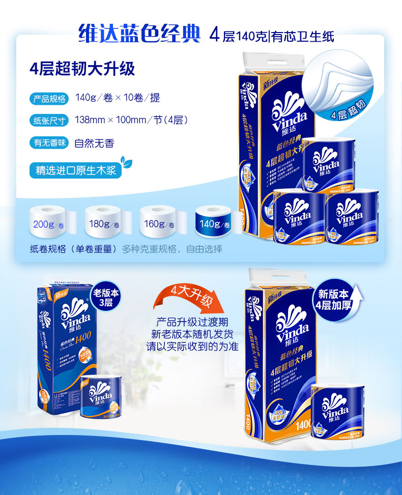 商品标题:维达V4069蓝色经典4层卷纸140g*10*6(单位:提)